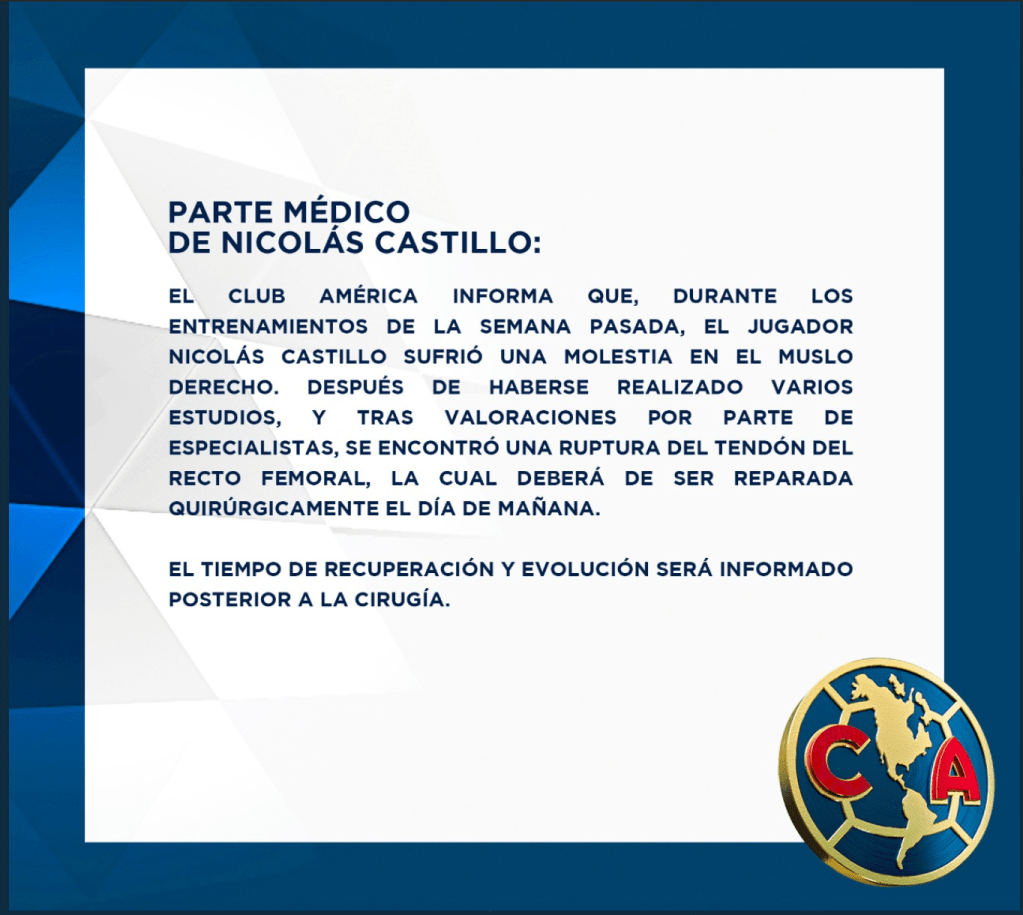 It is no surprise that Club America’s player, Nicolas Castillo is once again injured. This morning, Castillo underwent surgery, and as of now, his recovery time is indefinite.