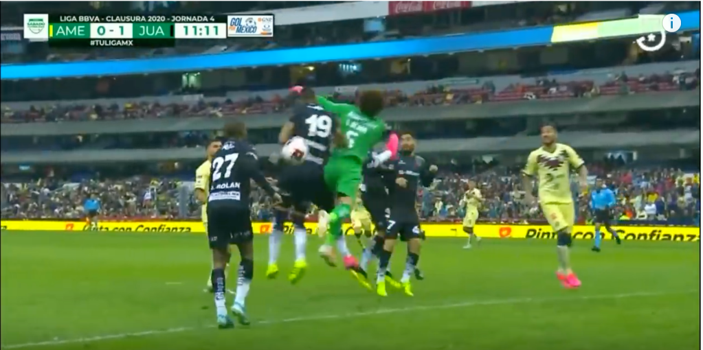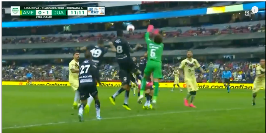 Despite the offside, goalkeeper Guillermo Ochoa makes a huge mistake while attempting to tackle the ball. He misses and instead with his left arm passes the ball to Juarez’s forward, Rolan. If Ochoa would have stayed in his area he could have prevented this mistake.